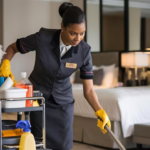 - Bathrooms: Disinfect toilets, sinks, and showers, clean mirrors, mop floors, and replace towels.